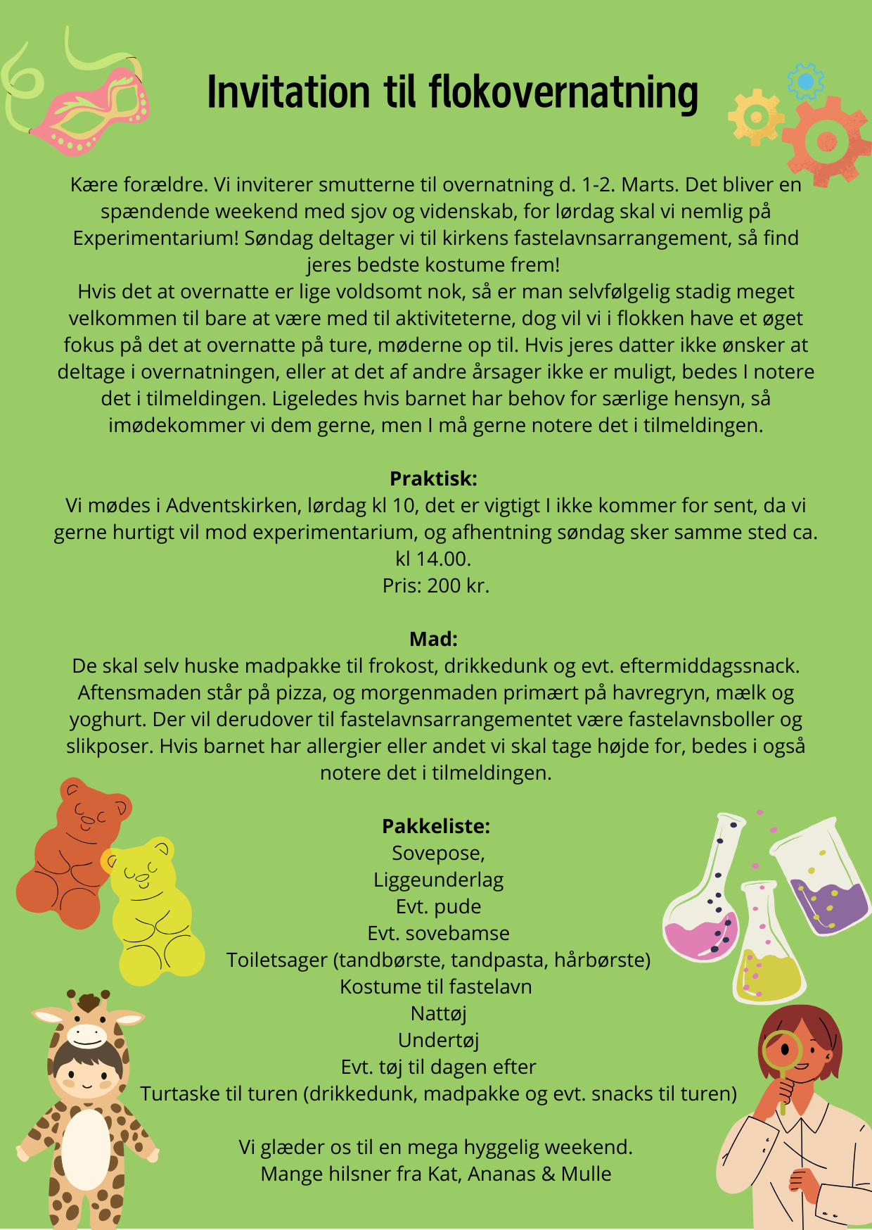 Kære forældre. Vi inviterer smutterne til overnatning d. 1-2. Marts. Det bliver en spændende weekend med sjov og videnskab, for lørdag skal vi nemlig på Experimentarium! Søndag deltager vi til kirkens fastelavnsarrangement, så find jeres bedste kostume frem!