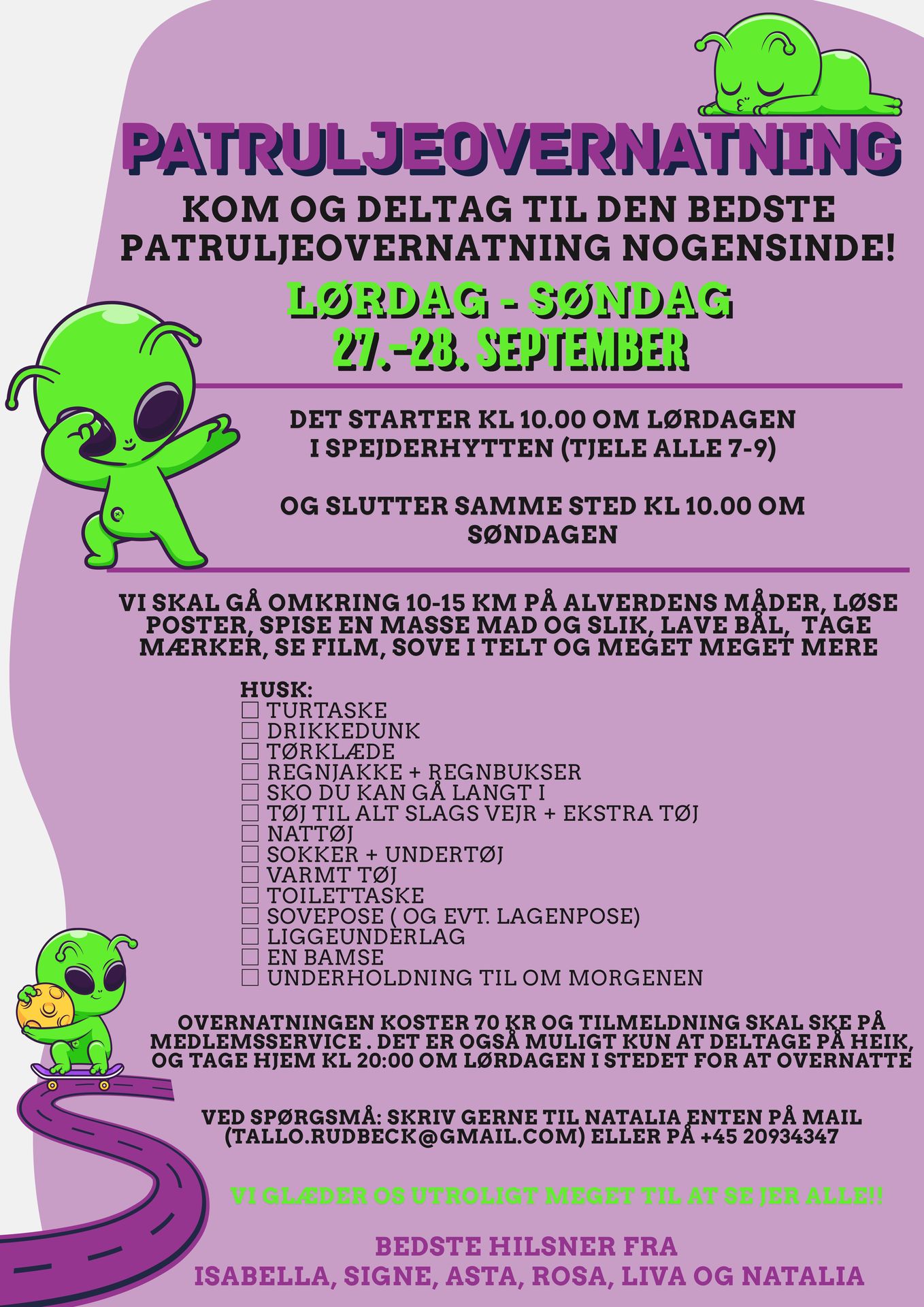 Vi inviterer alle de sejeste aliens til en lækker heik med overnatning. Vi skal i løbet af 24 fantastiske timer både hygge, måske lave bål og sove i telt ikke mindst have det sjovt!